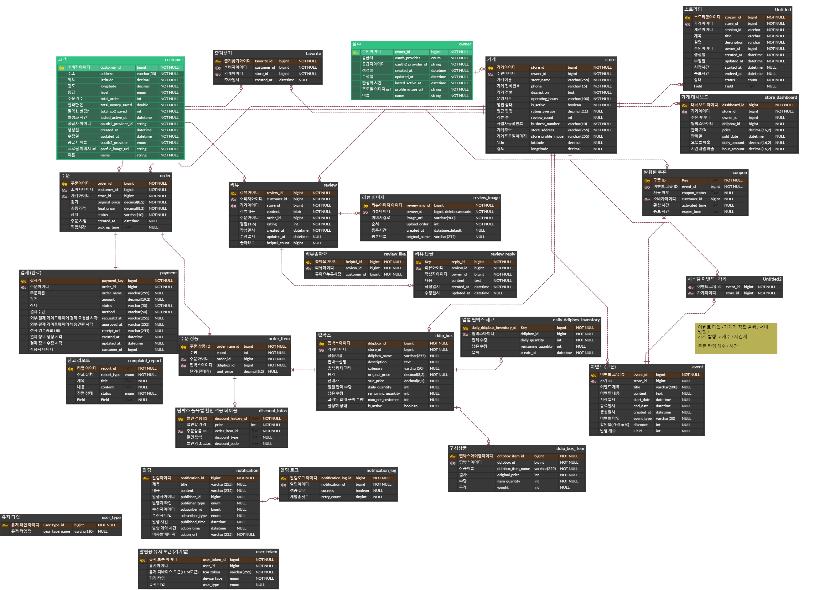 주문, 결제, FCM 푸시 알림, 가게 관리, 상품 관리, 리뷰, 스트리밍, 쿠폰 기능 등이 있다보니 테이블이 엄청 많다..