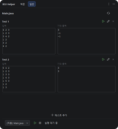 백준 문제가 아닌 일반 코드 파일에서도 입출력 테스트를 실행할 수 있습니다. BOJ Helper 도구 창의 일반 탭에서 테스트 케이스를 추가하고 실행합니다.